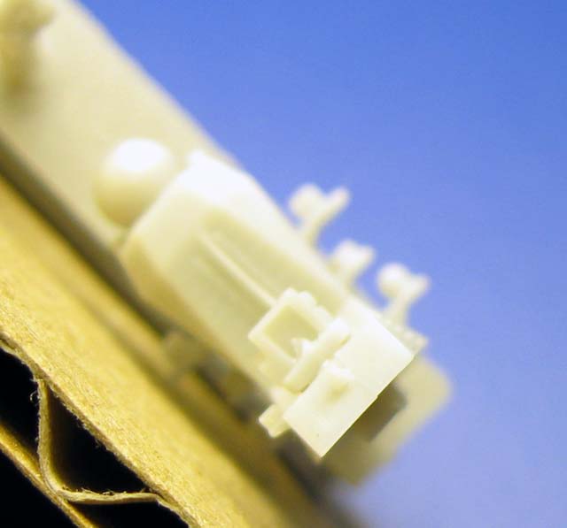 The remaining parts to build Steregushchy are on a single resin sprue. This sprue was attached to a piece of cardboard to protect the parts during shipping. The parts travelled with no blemishes or broken pieces. The 100mm gunhouse and Kashtan CIWS air defense mount are quite detailed, as are the "Harpoonski" SS-N-25 quad missle cannister launchers. The ships boats are here, with the primary sensor mast and the two antenna assemblies. Both of the antennas have a slight bend to them, which will be easy to fix with some warm water. |