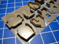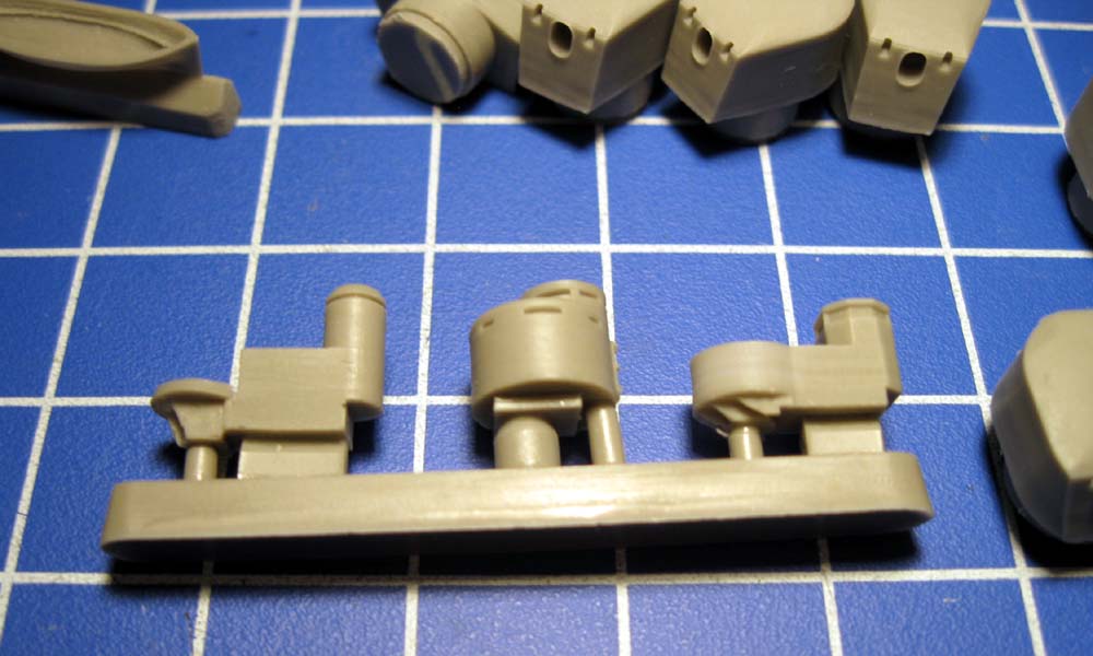 The "M" parts, M1-M18, are molded on from one single mold and joined by resin film. The various turrets are provided loose, and some are similar in shape and lack any sort of identifying part number, so close examination of page 2 of instructions will be required. The same applies to the remaining resin parts attached to sprues. The resin gun barrels have open muzzles cast in shape- and nice detail. Many of the resin parts exhibit moire patterns, indicating 3D printed masters; these patterns will need to be sanded or filled in before final assembly and paint. |