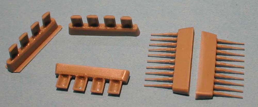 | The superstructure parts are nicely detailed and well cast. The main superstructure part fits perfectly into the socket in the hull. No sanding or fitting needed. The other bridge parts are cast on a resin wafer and some flat sanding will be needed to free them. You will notice that many are nicely engineered to for fit. The funnels are hollowed out and undercut on the bottom to give a good fit. The rest of the parts are virtually flash free and nicely detailed. Combrig supplies many of the mast parts in resin. I would suggest using these as templates for brass replacements (not included) if you intent to add rigging. | |||||||||||||||||