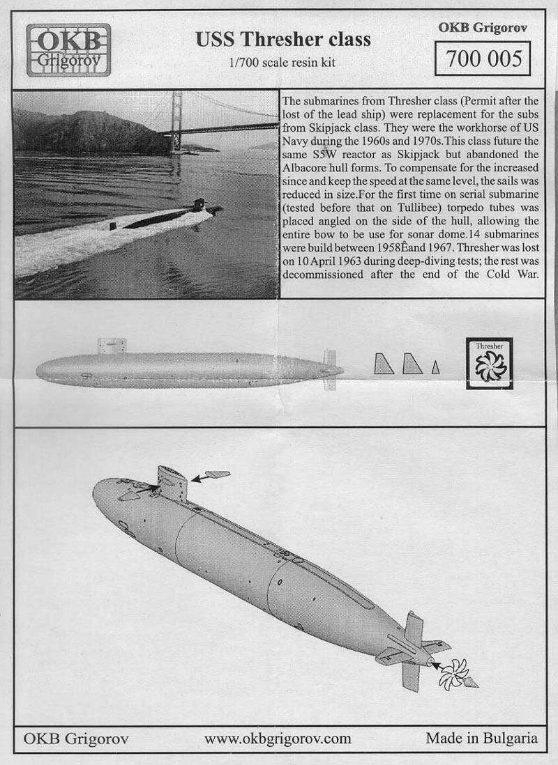 OKB continues to expand their coverage of 1/700 scale modern submarines, this nicely detailed Thresher is yet another piece of the puzzle. If you collect modern warships and/or subs , you need to add this one to your collection. This is kit # 08700005 USS Thresher class submarine with a list of