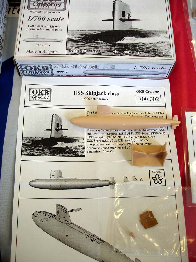 Another two new kits on the Retrowaves site are US submarines USS Skipjack, and USS Sturgeon. Both are priced at 11 Euros. These are both 700 scale full hull resin kits, and come with parts to complete the coning tower fins, and screw (in photoetch) assembly. Also included is a resin stand to display the model in the full hull version. The instructions are therefore very straight forward to understand, and a 3 dimensional perspective view is shown of the hull, and parts assembly, with a side elevation, and picture of the subject at sea together with a short history. The casting is similar to the OKB Grigorov Fort Drum kit using the same sandy coloured resin to produce a flawless hull with some detail included. There are no painting instructions, however, a quick Google will provide some ideas, and we think the “black” hull at this scale should be WEM tyre black with a rust colour to the underside of the hull. Periscopes are not provided but these should be easy enough to manufacture if required, and painted in the recommended camo schemes – again net reference should be the key to any queries. USS Skipjack SSN-585 was the first true nuclear attack submarine to be in service with its distinctive teardrop shape and was therefore the template on which further submarine progress was based. There were six in the class from 1956 – 1961. With the loss of Scorpion in 1963 the rest were scrapped in the early 1990’s marking the end of the “cold war”. USS Sturgeon SSN 637 is the larger of the duo and is noted as the “workhorse” of the US Navy’s attack submarines from 1963 – 1975. 37 of them were built, and they are distinguished by there “side” mounted torpedo tubes with the entire bow being dedicated to sonar technology. She was decommissioned in 1995. All the details, and further reading are available on the net. |