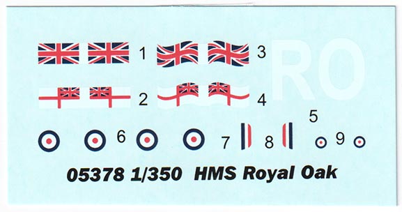 There is one small decal sheet included with the model. Included are "wavy" and straight versions of Navy Ensign and Jack, the "RO" painted on B Turret for part of Royal Oak's career, and markings for the Fairey IIIF biplane. There was a period of time in 1936-37 where three stripes in red, white, and then blue ran athwartships across B Turret and it would have been nice to have those included as the fit of the hsip is valid for this time period as well. |
