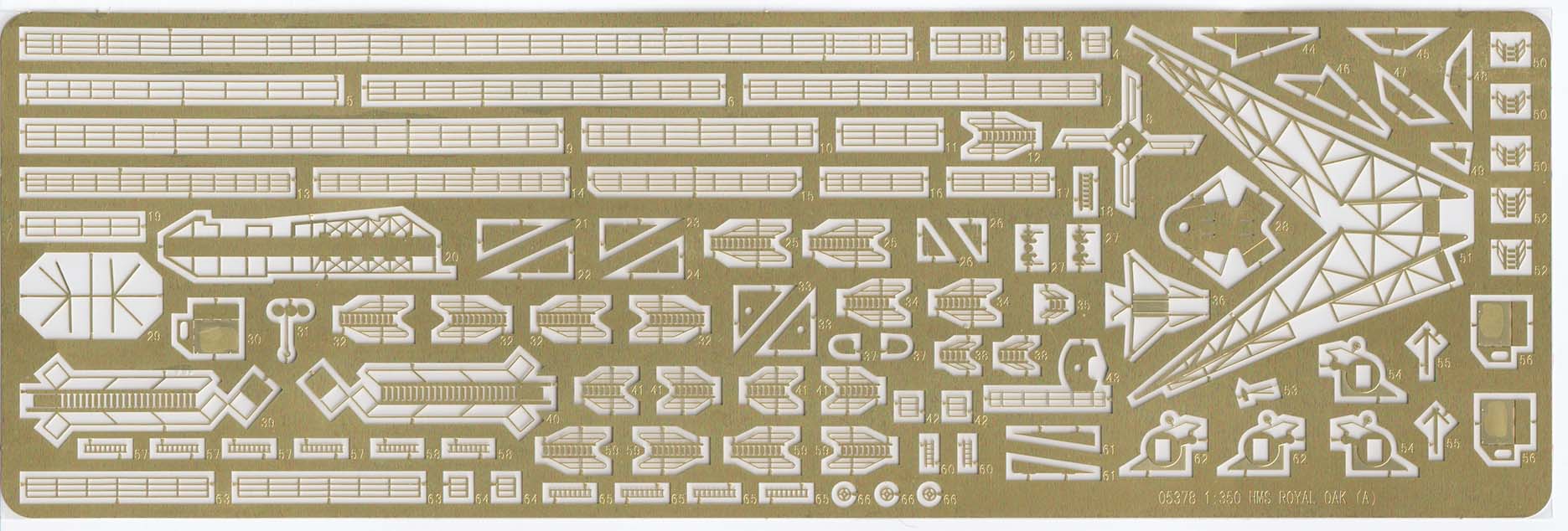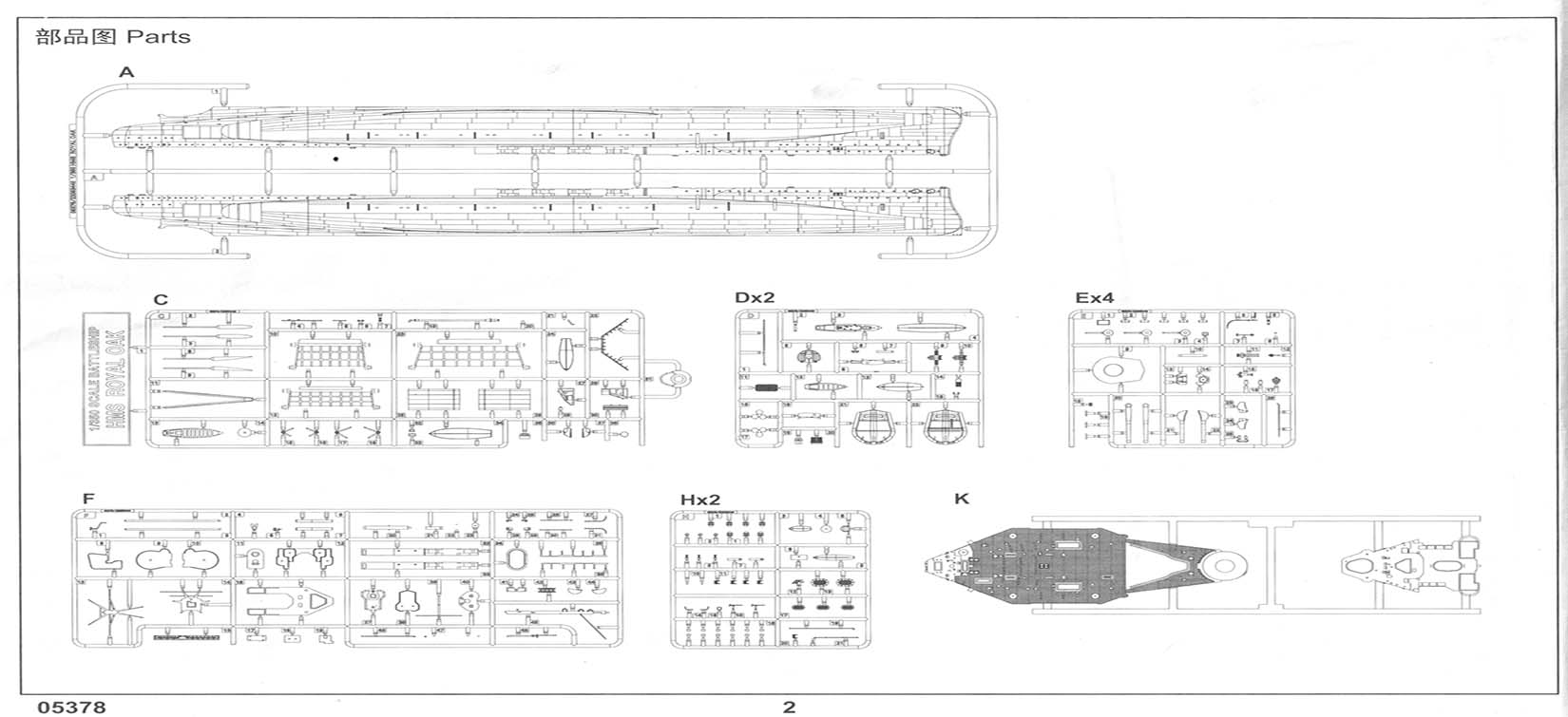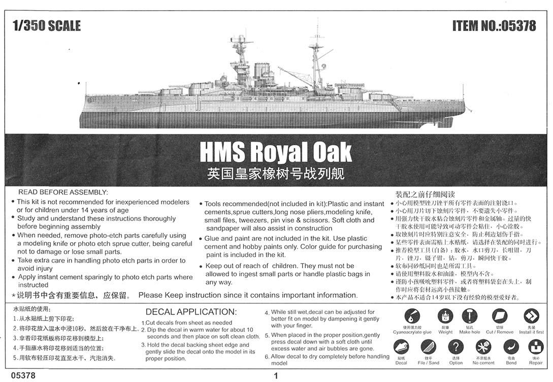 Trumpeter's 1/350th Royal Oak Kit 05378 The Trumpeter 1/350 HMS Royal Oak comes in the typical sturdy Trumpeter cardboard box with the usual painting of the ship on the top. There are over 500 parts on nineteen sprues (thirteen unique), three photo-etch frets, a separate black base, a booklet of instructions, a small decal sheet, and a small length of copper chain. No parts were damaged or had fallen off of the sprue trees when I opened the box. Royal Oak and her sisters were modernized throughout the 1930's and the kit represents Royal Oak after her final refit before the start of the war. This was early in the notion of defense from aerial attacks and this build should be more enjoyable for people who dislike building many anti-aircraft guns (there are a total of four, plus four 3-Pdr Hotchkiss guns). The photo-etch pieces are both a compliment (railings) and integral without plastic alternatives (crane, platform supports, and pieces of the Octuple Pom-Poms), so those without the desire or dexterity to handle photo-etch should take note. Plastic parts breakdown holds no surprises for those who have built a Trumpeter kit before.