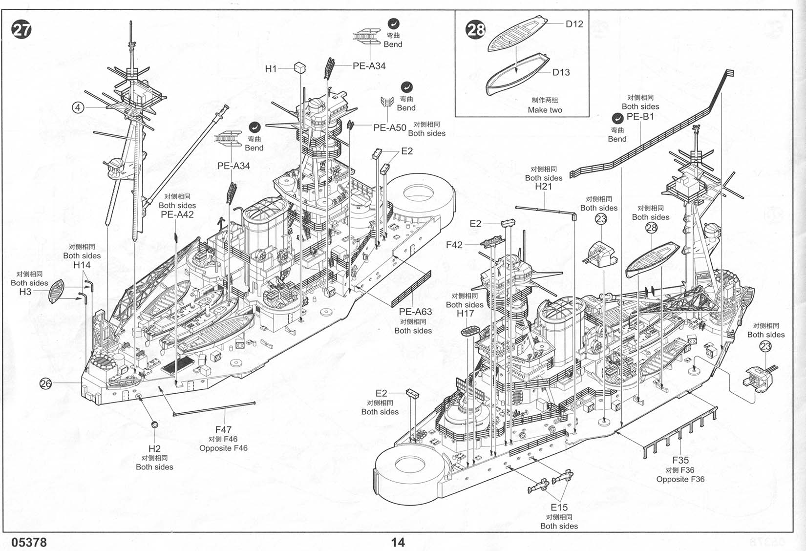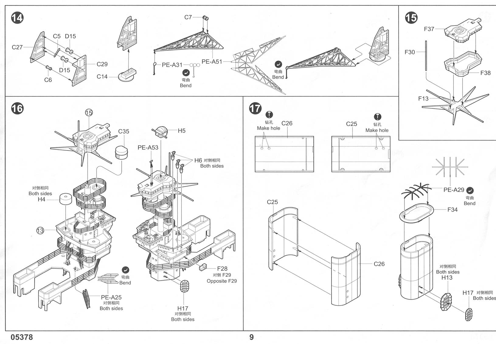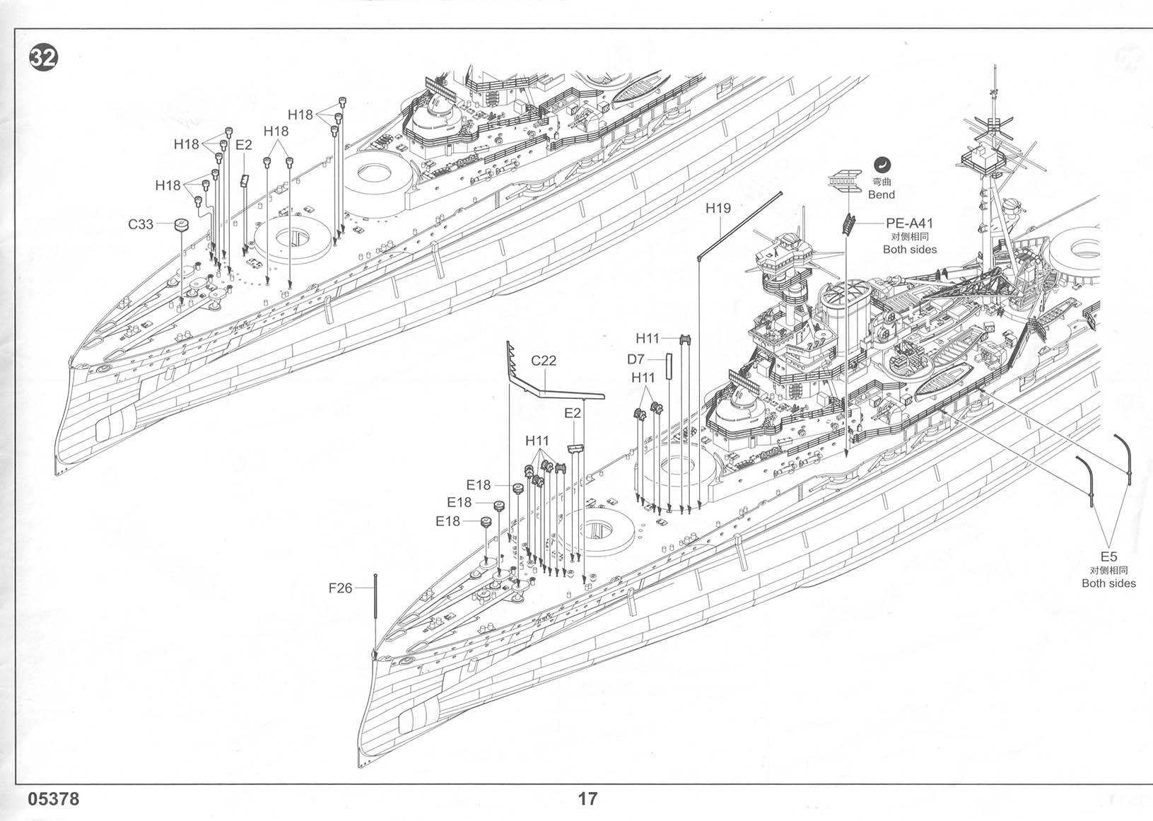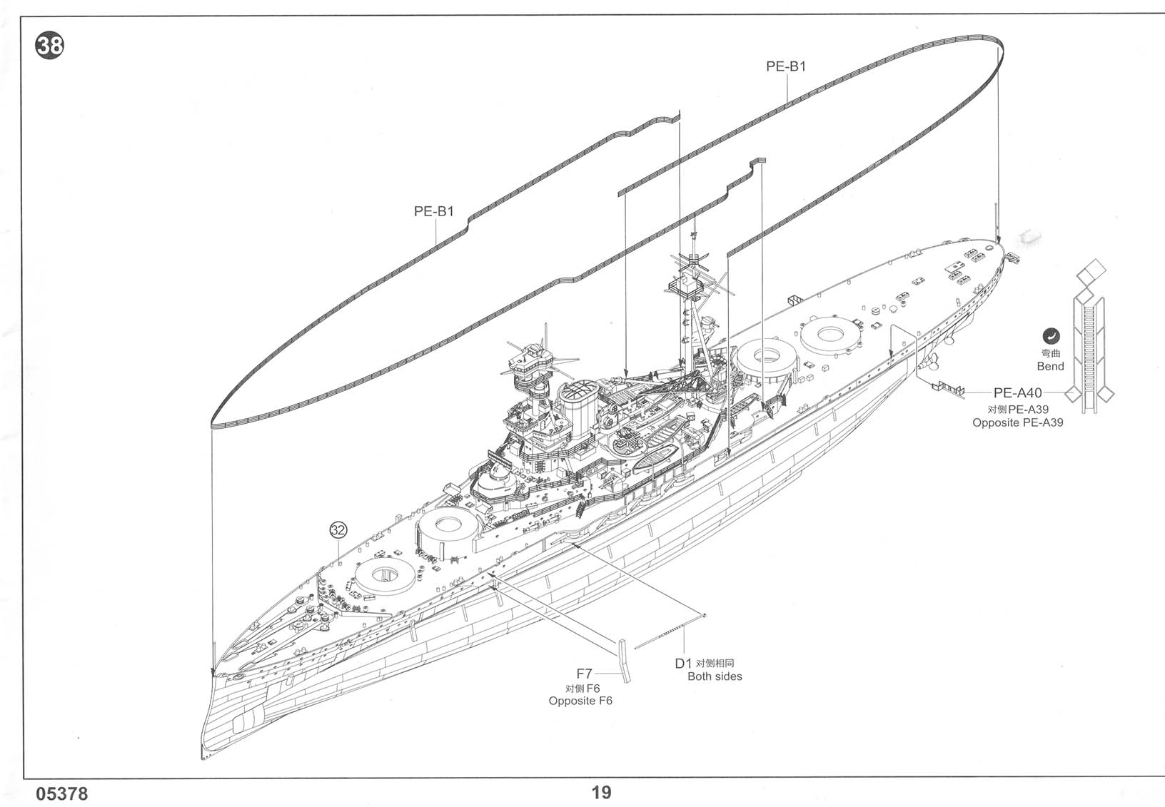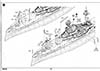 There are three photo-etch frets included in the kit, providing all of the deck-edge stanchion required. PE-A has individualized pieces, such as the inclined ladders, crane truss, and pre-sized pieces for certain platforms. PE-B has eight lengths of a standard three-bar railing as well as one section of shorter three-bar railing marked as "PE-B2" that I can find no reference to in the instructions. It's possible that this is meant for the boat deck area on the shelter deck level, but I am not sure. Regardless, there should be sections of two-bar railings for the conning tower level (including the separate pom-pom platforms), the two director platforms on the forward mast, and the incinerator house on the shelter deck immediately aft of the funnel (in between the Pom-Pom platforms but a level down, more or less). This is an OK basic set but leaves room for third parties to step in with more complete sets. |
