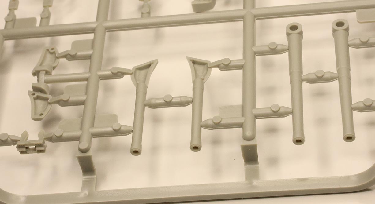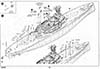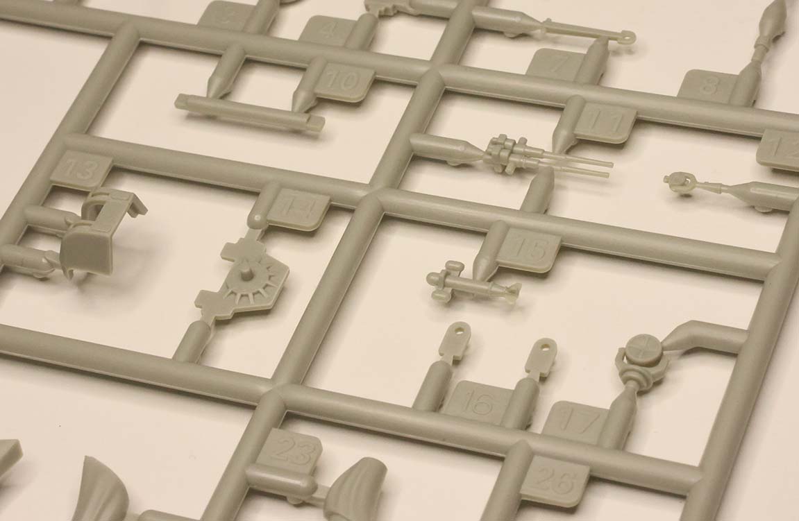 | SPRUE C Transverse interior supports, prop shafts and struts, funnel, armored conning tower, and some ship's boats |