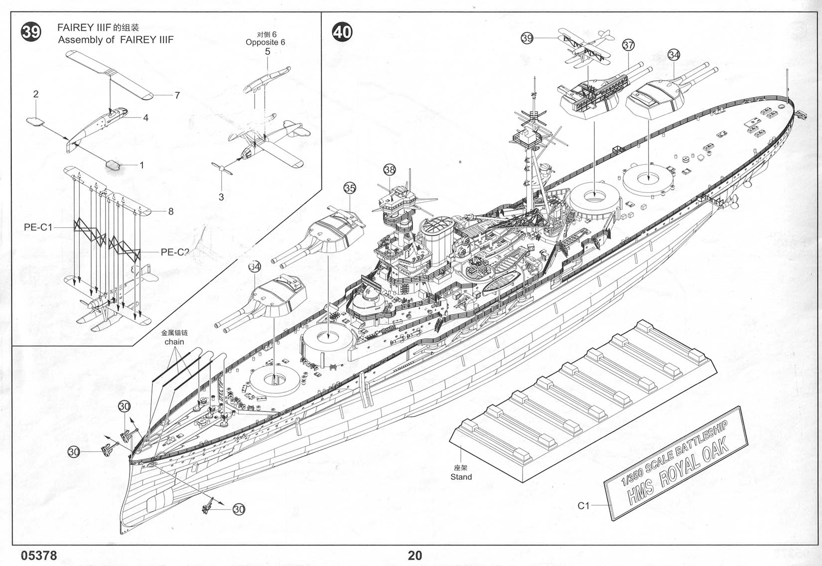 A 20-page instructions booklet is included that should be immediately familiar to anyone who has built a Trumpeter kit before. Exploded view line drawings walk the builder through a 40-step build process. Order of assembly is largely OK - largely sub assemblies are built up in a manner that will help minimize the possibility of damage, but there are a few cases where the order could have been changed for better protection of fragile parts (for example, putting the propellers, shafts and struts on after the main deck pieces instead of before). There is a color profile of the ship included as well, with color call outs for matching paints from a variety of modern manufacturers, including Mr. Hobby, Vallejo, Tamiya and Humbrol, but no data for actual Royal Navy paint is present. Paint at the time of loss was APC507B above the waterline with metal decks either covered in corticine or APC507A (and wood, of course). Royal Oak's anti-fouling was Gray as per Richard Dennis and not the "cocoa brown" called out for by the color sheet. |