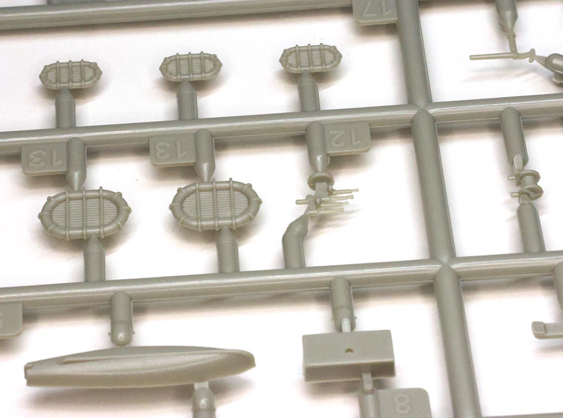 | The two "H" trees are similar to the two "D" trees in that they are together in a protective bag and partially, but not completely, wrapped in protective foam. There are a number of small details on each; such as vents, hawser reels, and booms as well as a HACS Mk III director, Hotchkiss 3-pdr and quad Vickers .50 cal machine guns. The detail on the 30' gig, 16' dinghy's, and carley floats is good, although there is a slight knocking pin mark inside near the stern on the 30' gig that might become more pronounced if one uses a wash to pick out the internal details. 4" ammo lockers for the QF guns are provided on this tree and there are knocking pin marks on the back - most of the lockers are positioned on deck such that this won't be an issue but there are few that will be visible. I think it would be easiest to use some Mr. Surfacer to fill the depressions and sand the backs while still on the parts tree before removing them given the size of the parts and size of the connection gate. | |||||||||||||||||||||||||