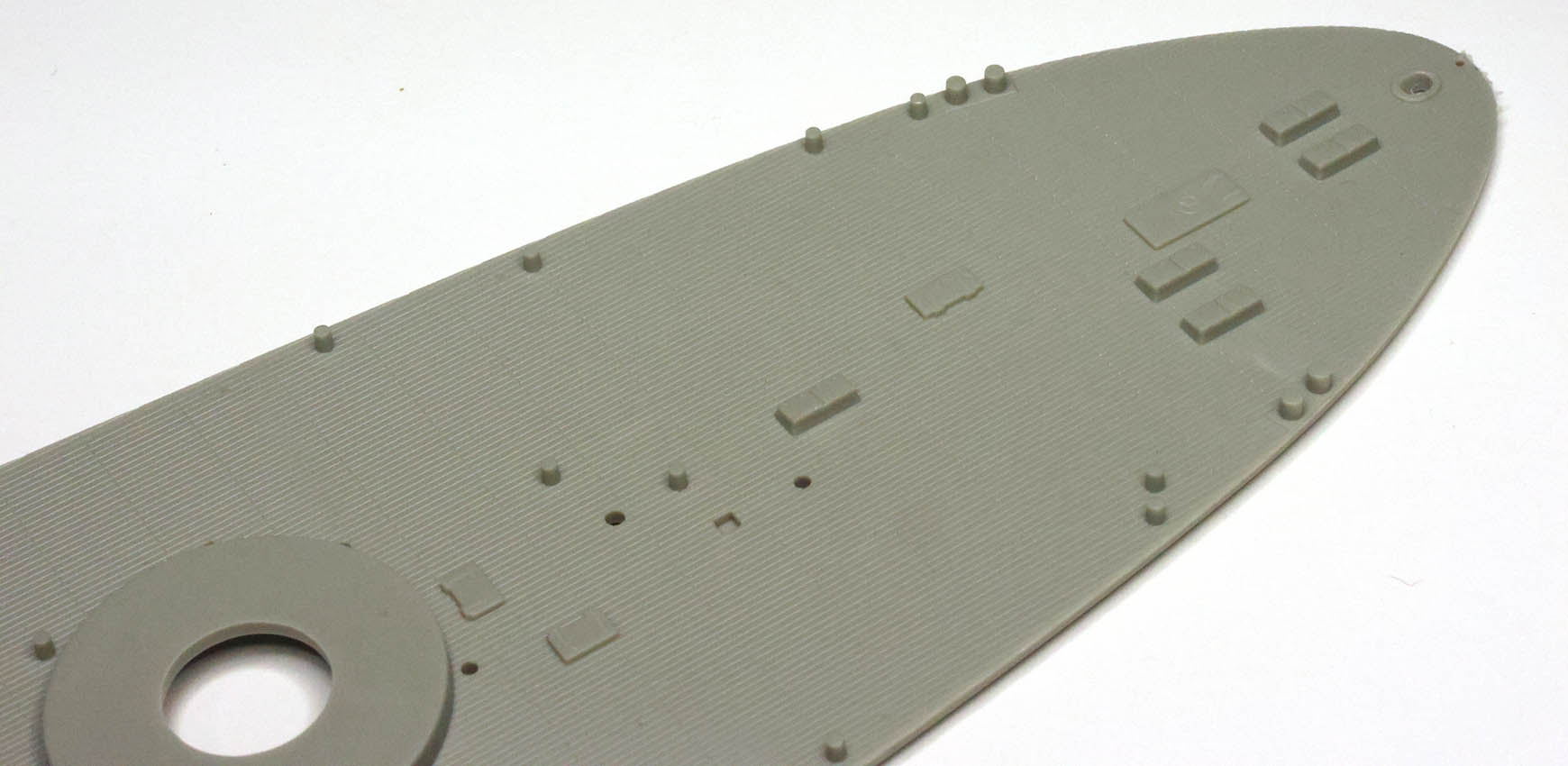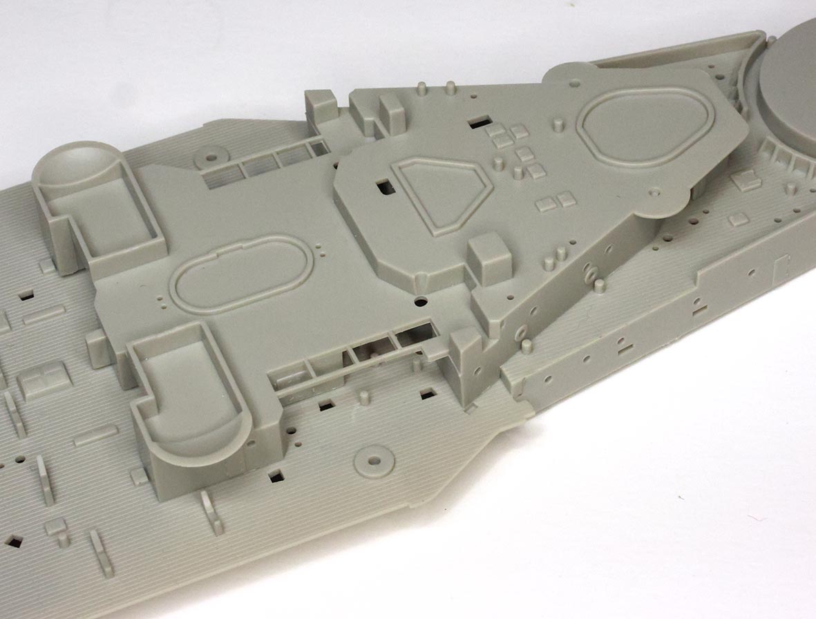 "A" tree has two pieces to make a full-hull rendition of the ship. There are no interior guides molded in to aid in cutting away the portion below the boot topping to create a waterline option. Three stiffening bulkheads are included on the "C" tree (oddly there is no "B" tree) that are probably unnecessary in most cases but may aid in lining up the main deck pieces for some. The attachment points along the deck edge are molded to negate clean up in the deck edge groove whereas the gates on the bottom and stern of the hull are up against the mating surface to protect (non-existent) surface detail. A nice and thoughtful effort largely for nought. Deck edge chocks are thin and hollow and better than earlier releases, but could still benefit from some of the new 3D printed resin offerings. The forefoot paravane skeg has three holes whereas photos of the wreck clearly show two (some independently drawn plans such as Kagero's and the Profile Morskie set show three but the wreck and Royal Navy official plans show two), but this should be trivial to fill in and sand. Portholes are appropriately sized and appear to match the layout of the ship, although I do not have authoritative plans for the port side and did not measure each one. There is a slight oval component to portholes at the very stern, but all told they are crisply molded and look good. The porthole eyebrows are incredibly fine and barely visible in some instances. There is raised hull plating detail molded on the hull; however it is rendered in fairly fine raised lines and not actual raised plates that would be a serious amount of work to remove as in earlier releases (such as the CV-5 / CV-6 kits in 1/350th) for those who choose to do so. Application of these hull plating lines is inconsistent - it is present on the original section of the hull and refitted torpedo blister below the waterline, but not above the blister's waterline. There is no real evidence of multi-part "slide" molding in use on the hull, and the fine lines taper into a total lack of detail on the bottom of the hull a bit after the turn of the bilge. There are no docking keels, sea water intake or exhaust detail on the undersides or hull sides. Likewise, the bilge keels are a bit thick and angle incorrectly (too shallow) and the bottom of the torpedo blisters are a bit simplified, but these are largely in an area that one would want to slap away those getting close enough to actually be able to see this detail. I lack the plans to give a firm review on the shape of the hull, but see enough differences in shape between the kit hull shape and some sectional drawings from the National Maritime Museum of Greenwich that I hope someone comes along with more plans and can give us a more in-depth review. I suspect that there are very few at this point that could point out shape discrepancies, if they exist, and will end with "it certainly looks like Royal Oak's hull based on the photos I have seen." |