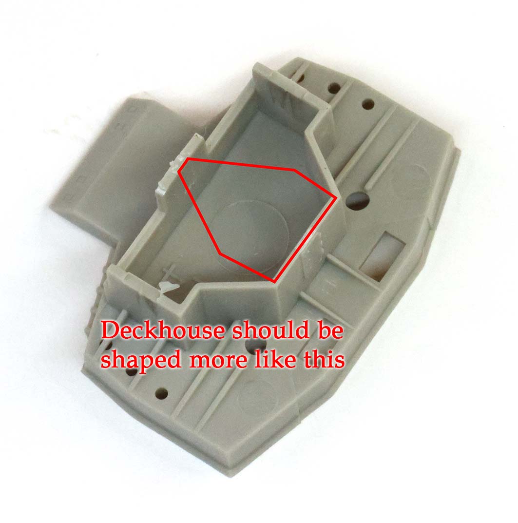 The final two major plastic pieces to discuss are Q1 and Q2, which are the Upper Deck and Forecastle Deck, Respectively. To avoid confusion it is worth noting that the "upper deck" is actually the deck below the forecastle deck, and might be referred to as the "aft deck" by some. Planking is fine and the joints offset (every other plank - I have no plan that shows what this ought to be). Hatches and deck details match the National Maritime Plans fairly well, althought there are there are four hatches at the aft end of the forecastle deck which should be vents (two of them can be easily built with some quarter round styrene). There is no deck camber in these pieces, which Royal Oak had (as did the shelter deck, rendered as piece K2 as discussed above) according to plans. The anchor chain chafing plates do not match those in the Royal Navy plans - however the plans lack any sort of detail on planking and I haven't found any clear photos that show what the chafing plates fully looked like and the kit may be close to correct. |